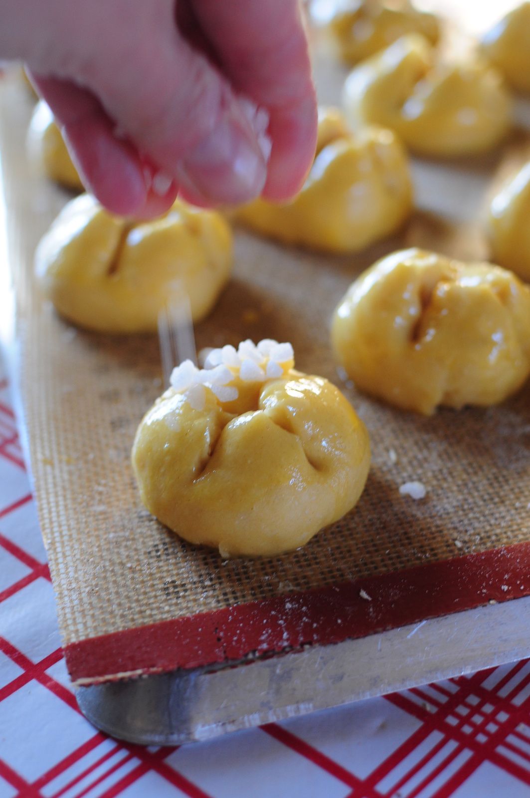Dégazer le pâton, prélever 12 boules de pâte puis les façonner. Les déposer sur du papier sulfurisé et laisser à nouveau doubler de volume.