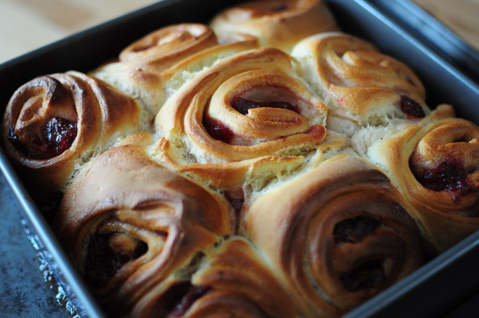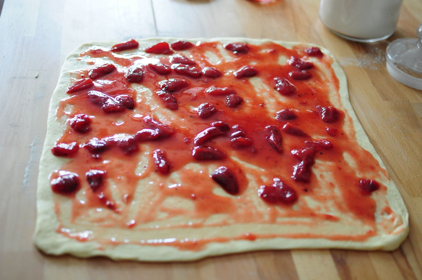 Il s'agit donc d'une brioche roulée avec une mie de déglingo, fourrée d'une confiture de fraises dans laquelle on a laissé d'énormes morceaux et que l'on a parfumé à la vanille, exit la cannelle de la recette originale.