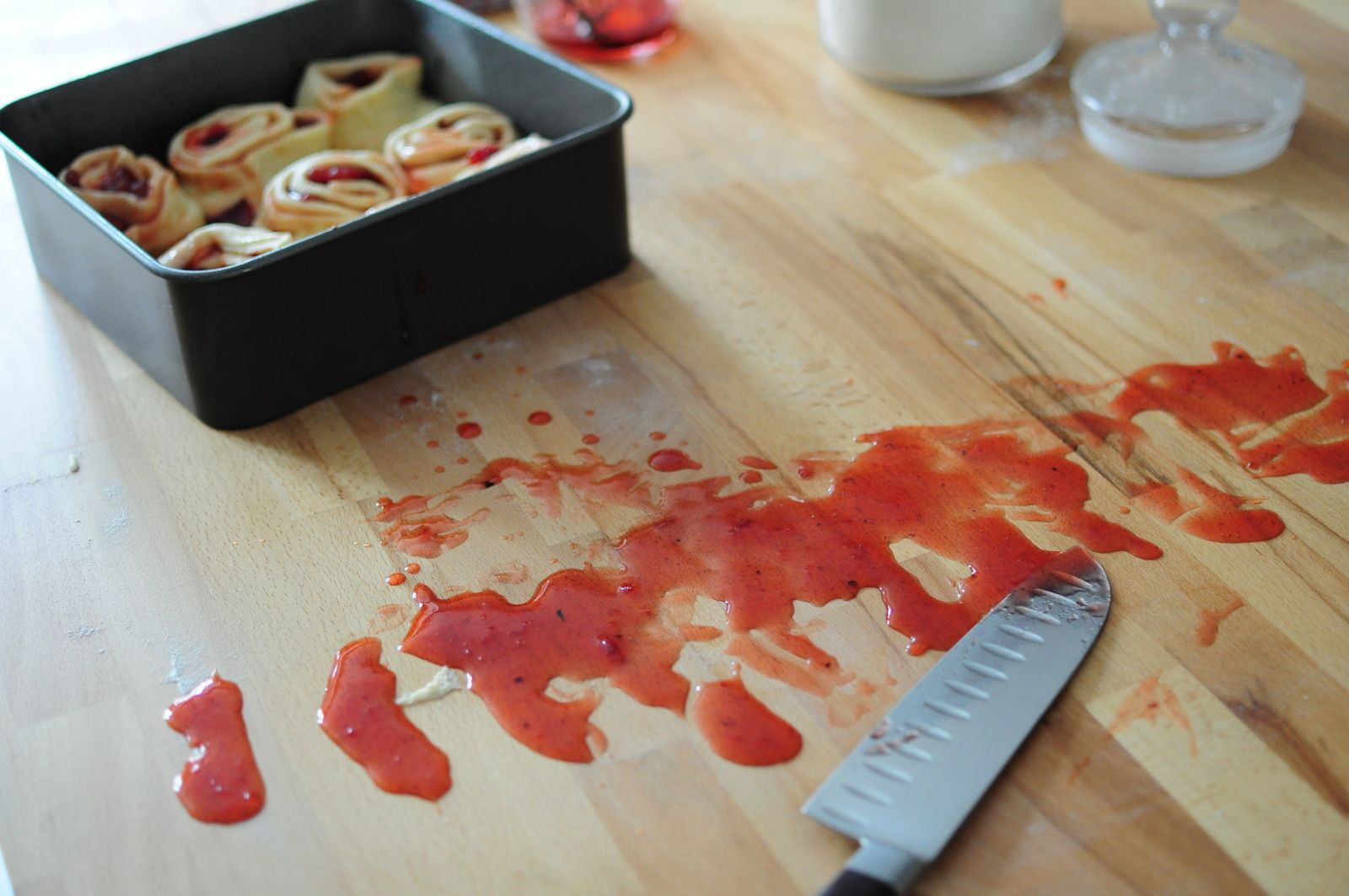 Étaler la confiture dessus (en ne mettant pas de gros morceaux sur les 10 derniers cm) et rouler (Dexter dans la cuisine !!).
